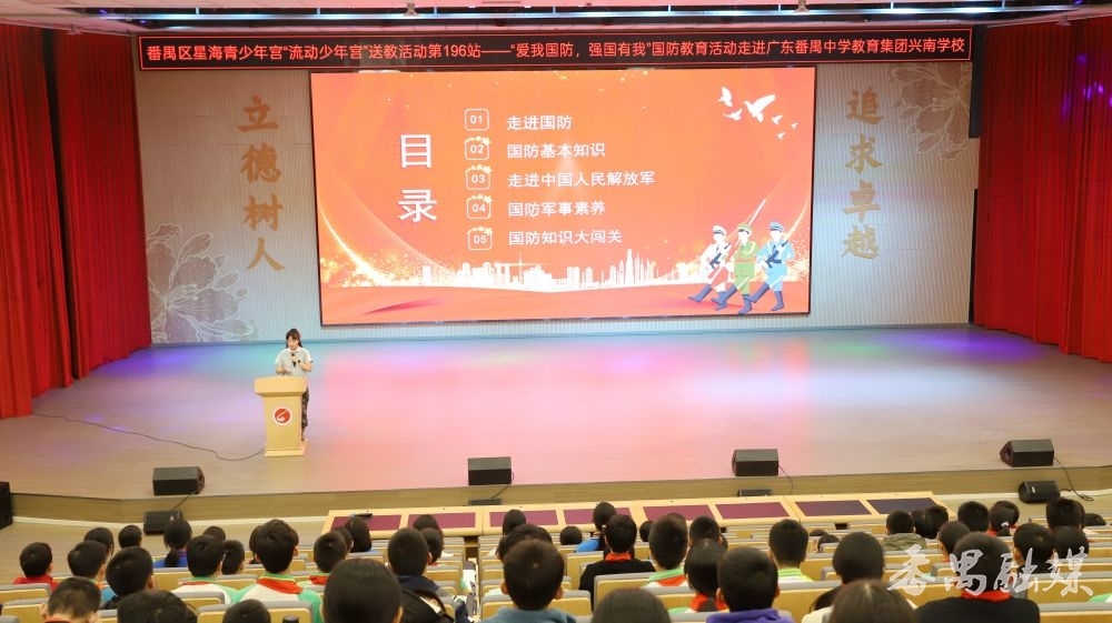 在兴南学校大会堂里,番禺区星海青少年宫退役女军人张老师为六年级学生带来了一堂主题为“爱我国防强国有我”的国防教育课。课程从国防基础知识切入,结合鲜活案例生动阐释国防建设对国家发展、人民幸福的重要意义,引导学生树立“强国必有我”的责任意识。